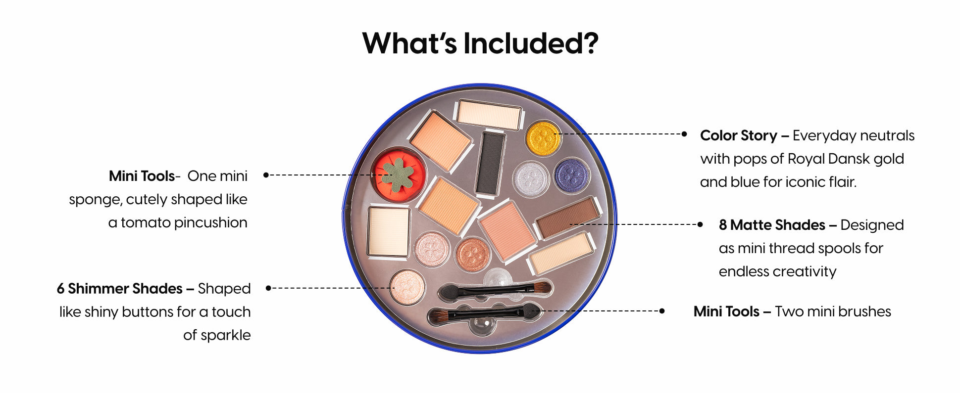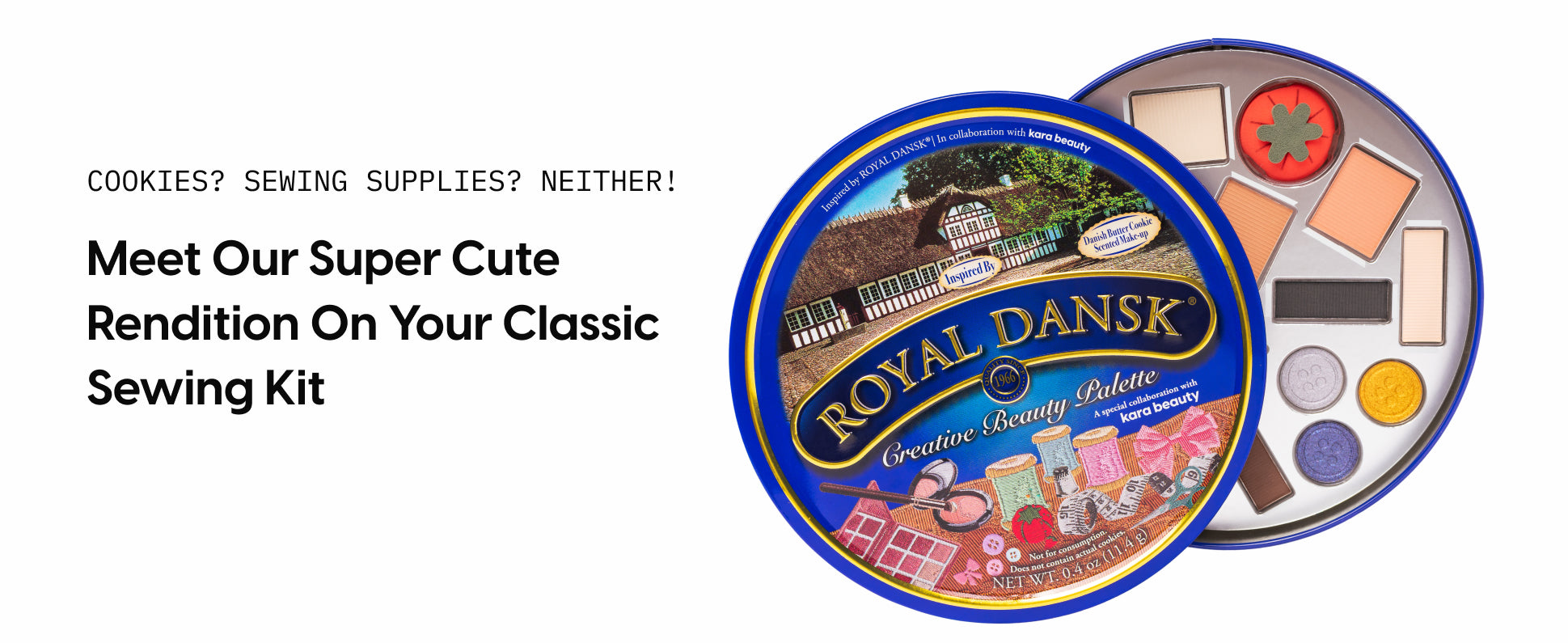 A nostalgic cookie tin that looks like a sewing kit and opens to reveal a playful, limited edition beauty palette